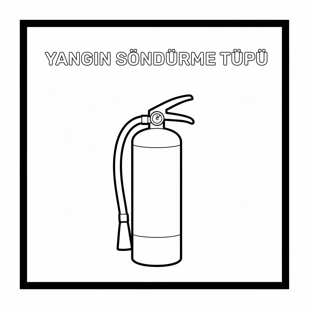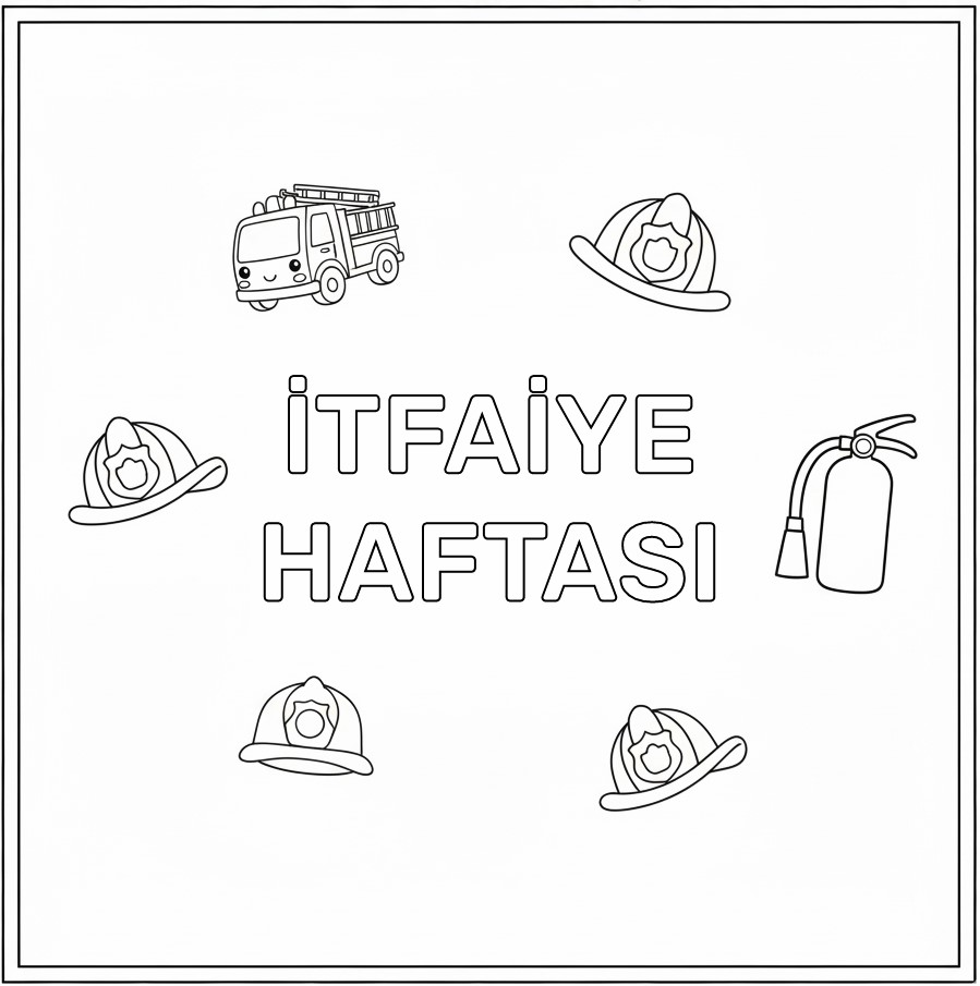 İtfaiye Haftası kutlaması boyama sayfası için ortada büyük bir ‘İtfaiye Haftası’ yazısı, etrafında küçük bir itfaiye aracı, miğfer ve yangın söndürücü figürleri bulunan bir görsel oluşturuldu.
